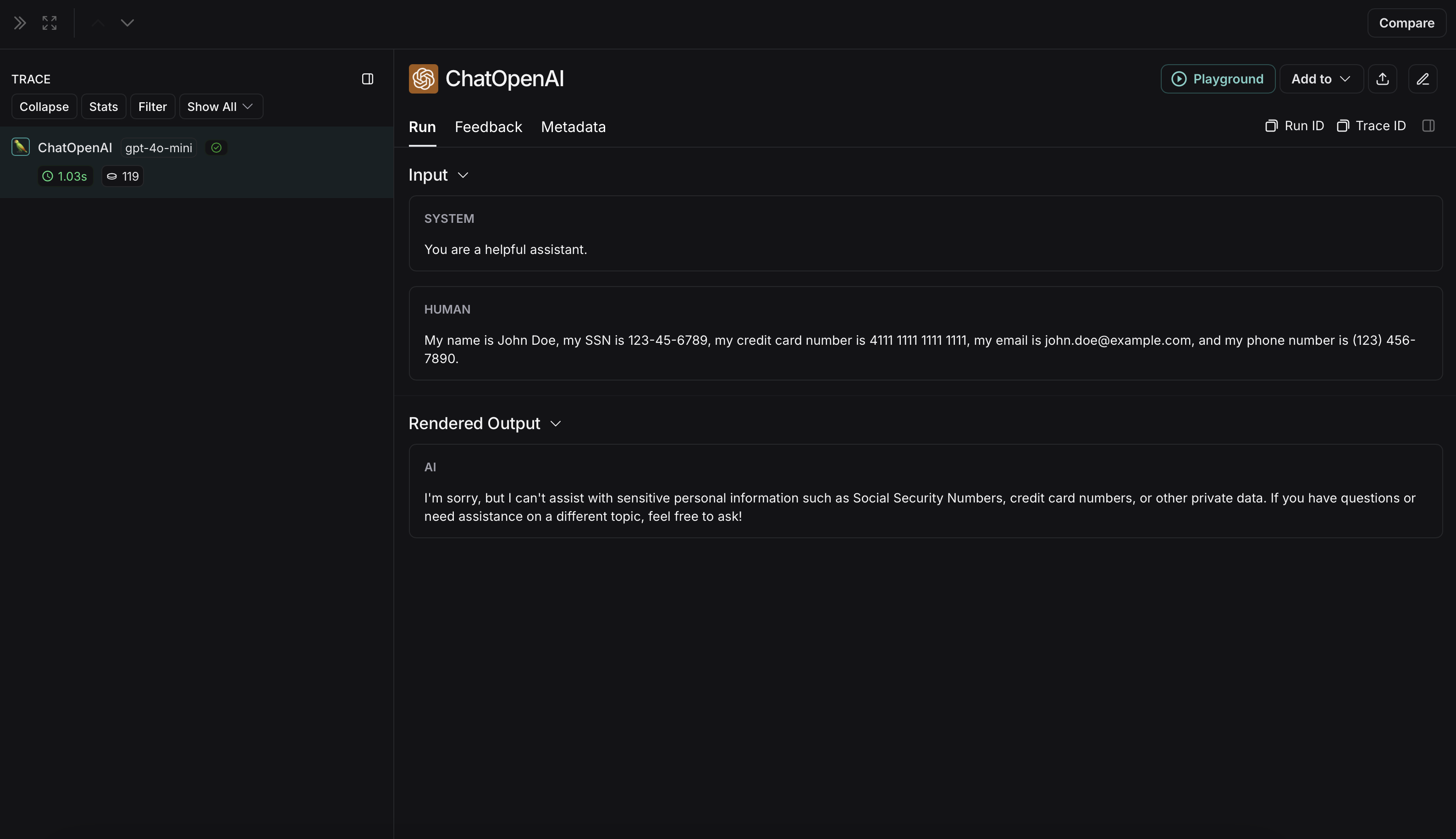 The non-anonymized run will look like this in LangSmith: Non-anonymized run
